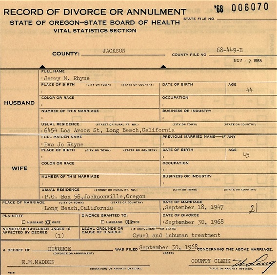 September 30, 1968 Jerry and Eva Jo were divorced in Jackson County, Oregon where