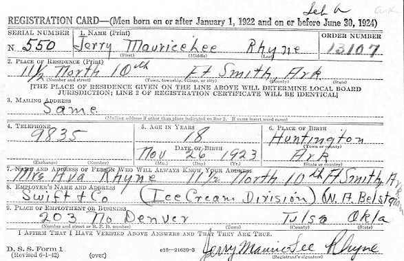 Jerry Maurice Lee Rhyne was born November 26, 1923 at Huntington, Sebastian