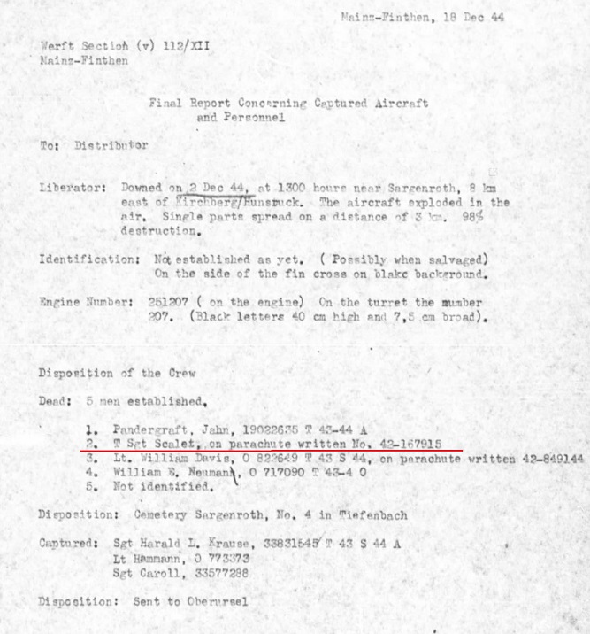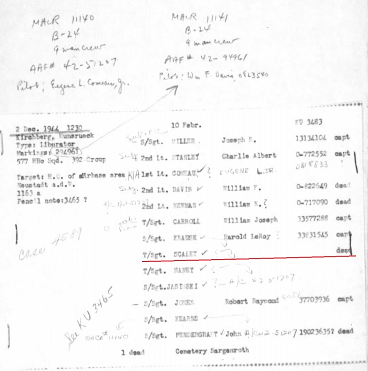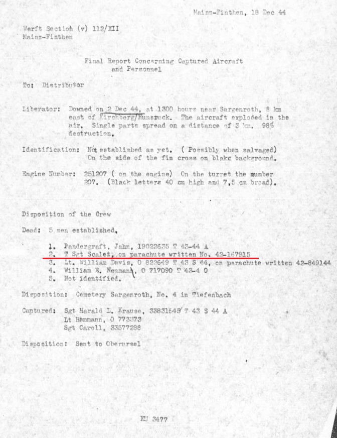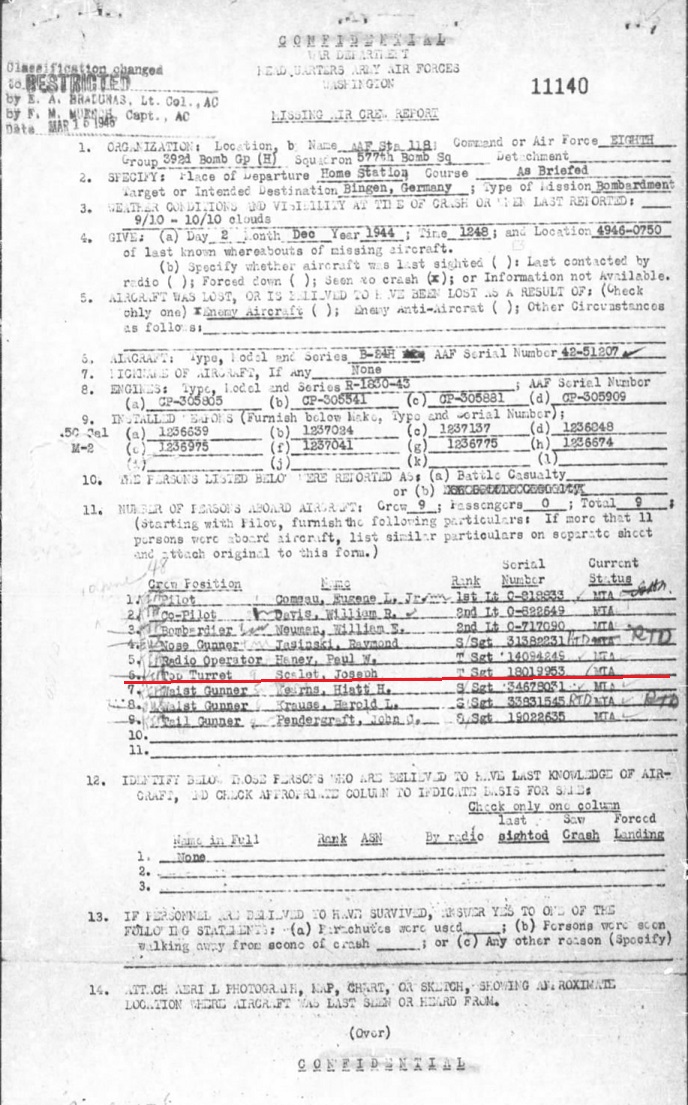 Squad 8th Army Air Coprs and was killed in action Dec 2, 1944 at 1300 hours near