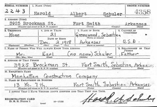 Harold A. Schuler was born Dec 2, 1918 in Sebastian County, Arkansas to