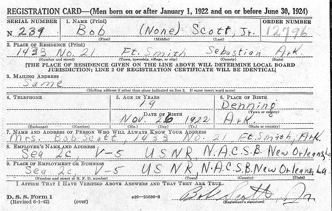 Robert "Bob" Scott was born November 26, 1922 at Fort Smith, Sebastian Co.,