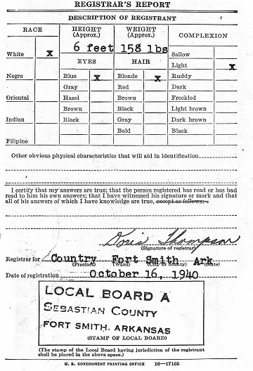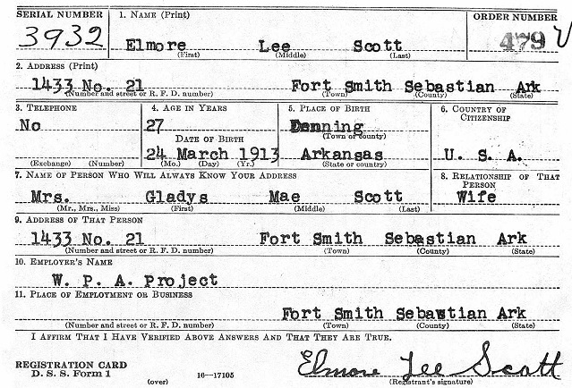 Elmore registered for the military draft October 16, 1940 at Fort Smith, Sebastian Co,