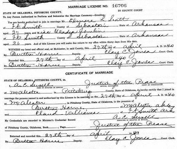 Pittsburg, Oklahoma. Elmore and Gladys were both residents of Fort Smith at that