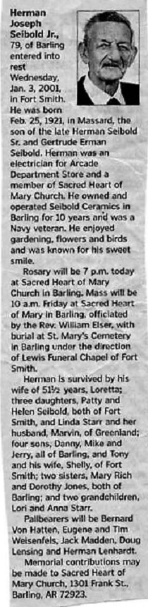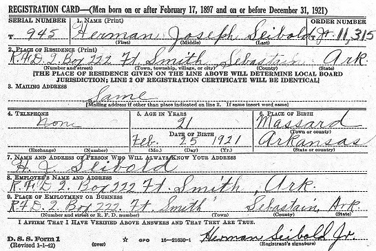 Herman Joseph Seibold Jr. was born Feb 24, 1921 in south Sebastian Co., Ar.to