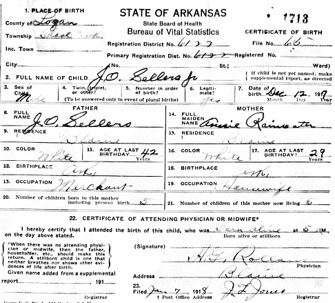 James Oliver Sellars, Jr was born Dec 12, 1917 in Shoal Creek, Logan Co., Arkansas to