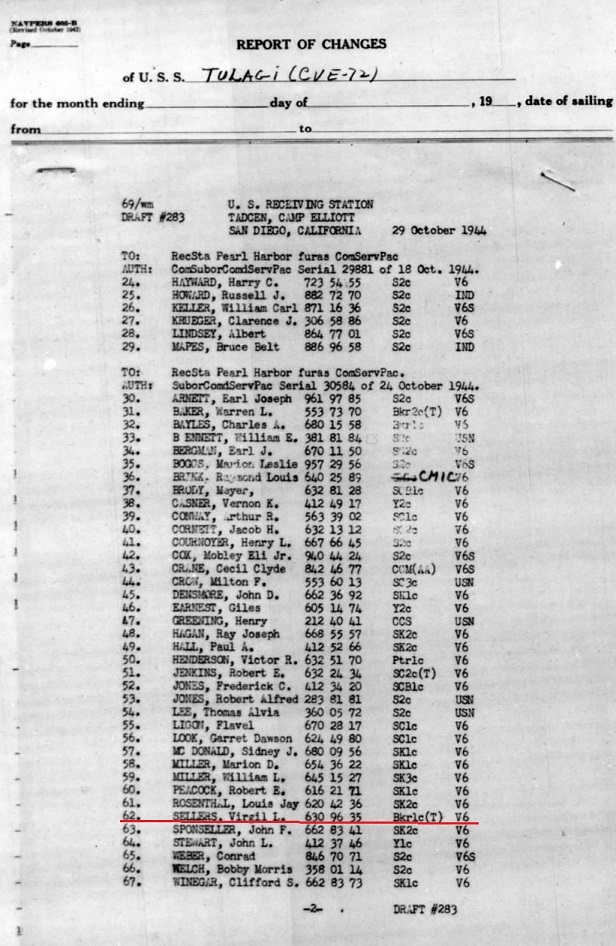 On Oct. 29 1944 Baker 1st Class Virgil L. Sellers is found aboard the USS Tulagi (CVE-72)