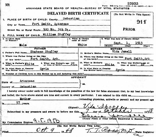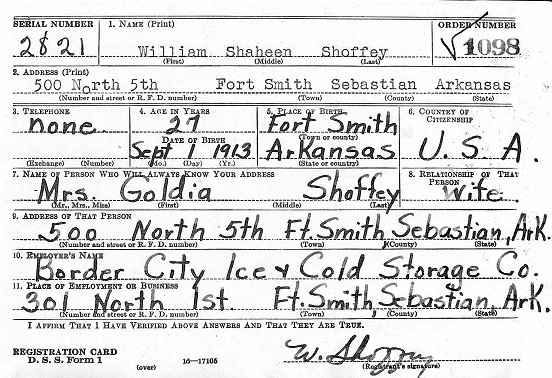 William Shaheen Shoffey was born Septemter 1, 1913 in Fort Smith, Sebastian Co., Ar. to