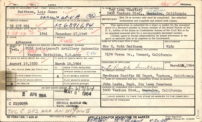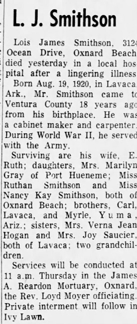 Lois James Smithson passed away on Mar 16, 1964 and is buried at Ivy Lawn Memorial Park