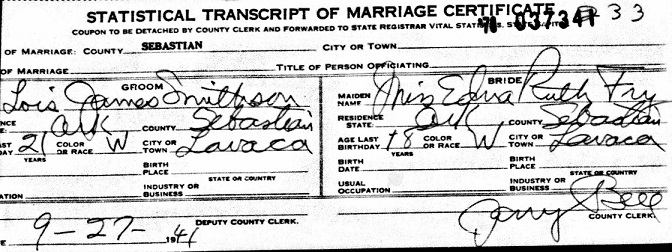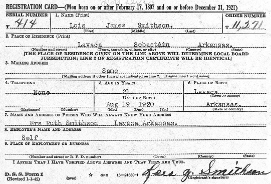Lois James Smithson was born Aug 19, 1920 in Big Creek Township, Sebastian Co., Ar.