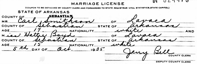 October 5, 1935 Carl married 15 year old Hattie Louise Boyd in Lavaca, Sebastian Co., Ar. where