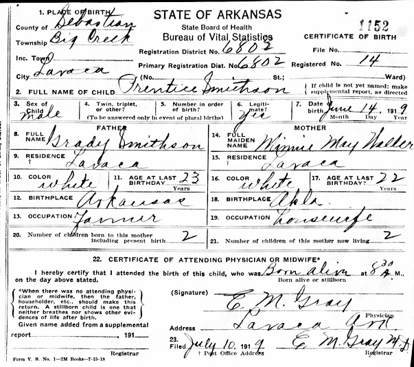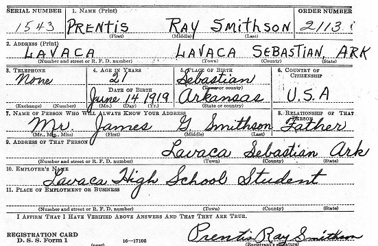 Prentiss Ray Smithson was born June 14, 1919 in Big Creek Township, Sebastian Co., Ar.