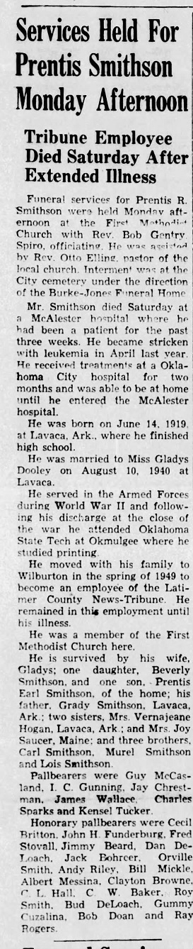 Prentiss Ray Smithson passed away in a hospital in McAlester, Ok Jan 23, 1960 and