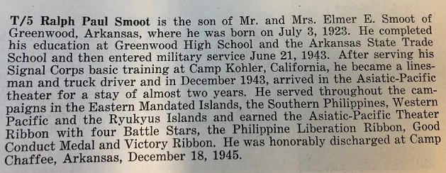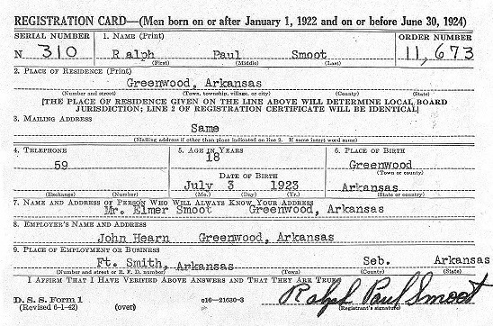 Ralph Paul Smoot was born July 3 1923 in Greenwood, Sebastian Co., Arkansas to