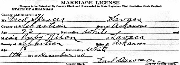 On December 17, 1930 Fred married Ruby Nixon of Lavaca, Sebastian Co., Ar.