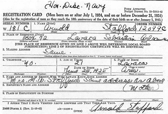 Arnold Stafford was born June 25, 1925 in Sebastian Co., Ar. to Gideon Andrews &