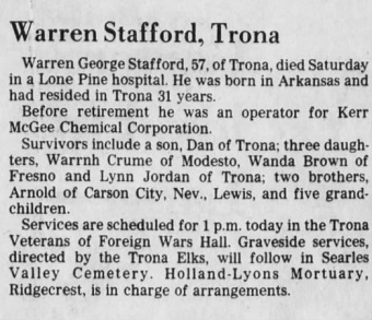 Warren George Stafford passed away Deceber 2, 1978 at Inyo County, California.