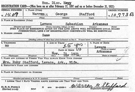 Warren George Stafford was born November 24, 1921 at Lavaca, Sebastian Co., Ar.