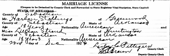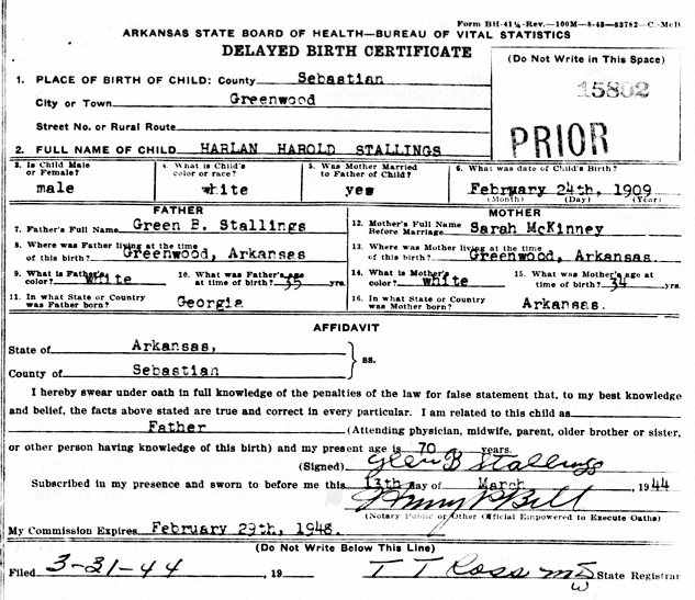 Harlon Harold Stallings was born 24 Feb 1909 at Greenwood, Sebastian Co., Ar. to