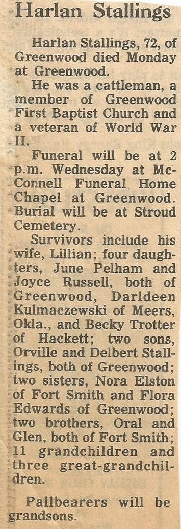 Harlon Harold Stallings passed away June 1, 1981 at Greenwood, Sebastian co., Ar.