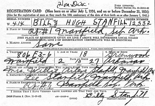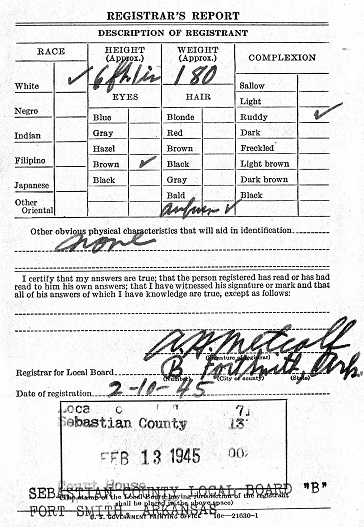 February 10, 1945 Billy registered for the military draft at Fort Smith, Sebastian Co., Ar.