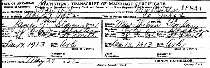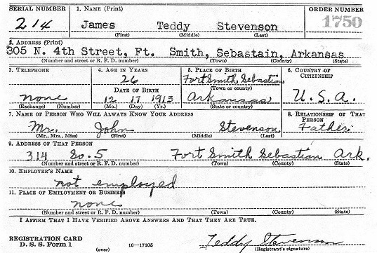 James Teddy Stevenson was born Decenber 17, 1913 in Fort Smith, Sebastian Co., Ar. to