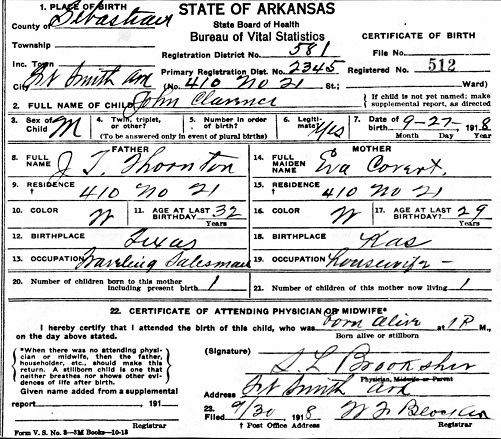 John Clarence Thornton was born 17 Sep 1920 in Fort Smith, Sebastian Co., Ar.