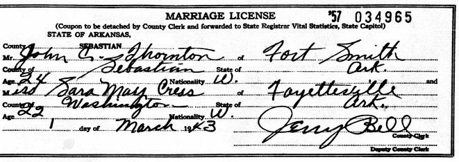 to John Tarrell & Eva Lynn Aikman Thornton. On 5 Mar 1943 in Fort Smith, Ar.