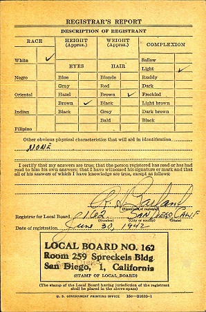 June 30, 1942 Wayne registered for the military draft in San Diego, California.