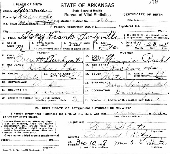Troy Frank Turbyville was born November 23, 1918 in Lawrence Co., Arkansas