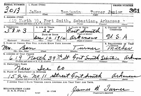 James Benjamin "J.B." Turner, Jr. was born 14 Dec 1914 in Fort Smith, Sebastian Co., Ar.