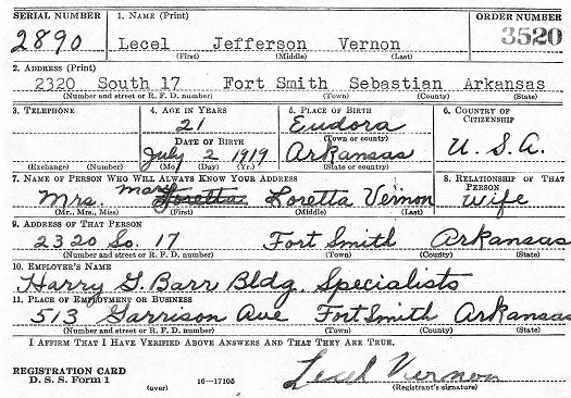 Lecel Jefferson Vernon of Fort Smith(Sebastian County), Arkansas, died Monday, March 24, 2008, at Crawford Healthcare & Rehabilitation Center. He was 88 years old.