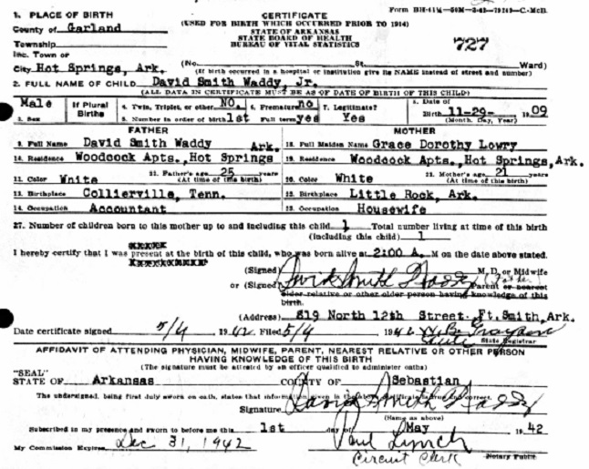 David Smith Waddy, Jr. was born November 29, 1909 in Hot Sprinhgs, Garland Co., Ar.