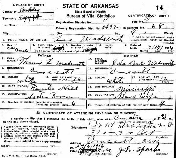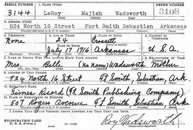 Leroy Majiah (Roy M.) Wadsworth was born July 17, 1916 in Crossett, Ashley Co., Ar. to