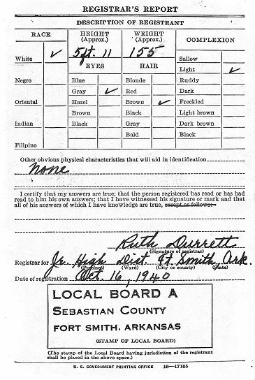 Roy registered for the military draft October 16, 1940 at the Jr. High School at Ft. Smith, Ar.