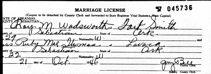 October 21, 1946 while residing at Fort Smith, Sebastian Co., Ar. Roy married