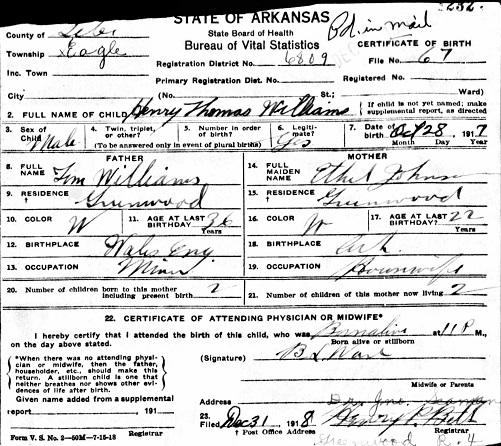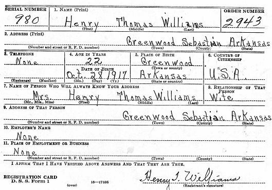 Henry Thomas Williams was born October 28, 1917 in Greenwood,Sebastian Co., Ar. to