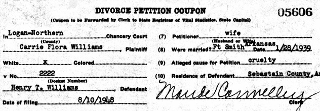 in Franklin Co., Ar. On August 10, 1948 Henry & Carrie divorced at Logan, Northern District,