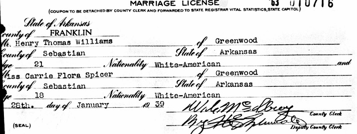 married Carrie Flora Spicer. Both were residents of Greenwood, Ar. They married