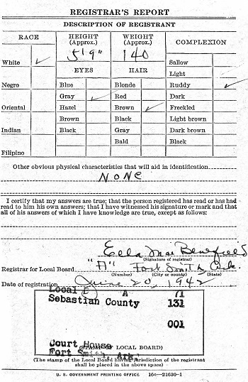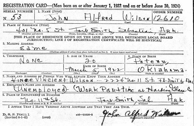 June 20, 1942 John registered for the military draft at the Court House in Fort Smith, Sebastian