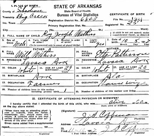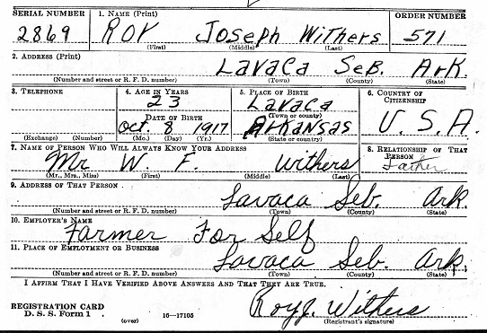 Roy Joseph Withers was born October 8, 1917 in Lavaca, Sebastian Co., Arkansas to