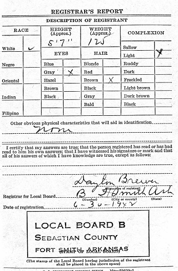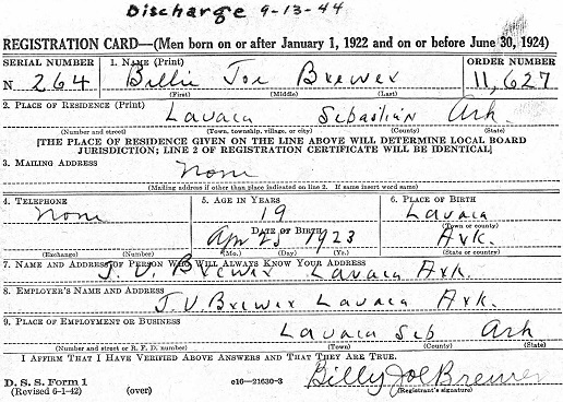 June 30, 1942 Billy Joe registered for the miliary draft in Fort Smith, Sebastian Co., Ar.