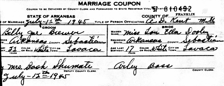 James "Jim" Van & Neva Eads Brewer. July 12, 1945 Billy Joe married