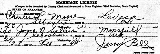 in Lavaca, Big Creek, Sebastian Co., Ar. married Joyce T. Sellers from Mansfield, Sebastian Co.,