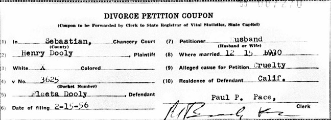 Fluta Davis of Greenwood, Sebastian Co., Ar. Feb 15, Henry and Fluta were divorced.