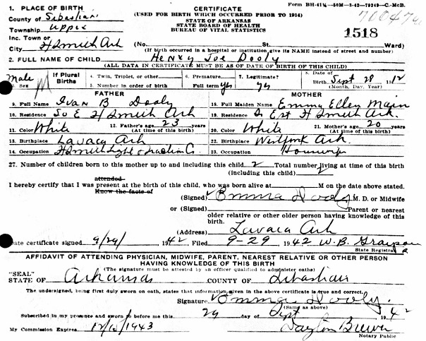 Henry Joseph Dooly was born 28 Sep 1912 in Fort Smith, Sebastian Co., Ar. to
