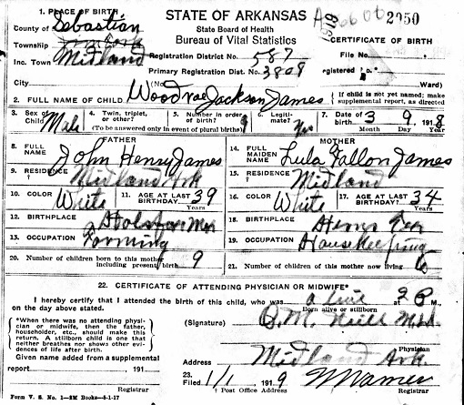 Woodrow Jackson James was born March 9, 1918 in Midland, Jim Fork, Sebastian, Arkansas