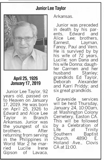 Clovis, Fresno County, Ca. on January 17, 2019. He was buried in