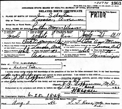 Luther Mayes Weaver was born July 21, 1911 in Lavaca, Sebastian Co. Ar. to