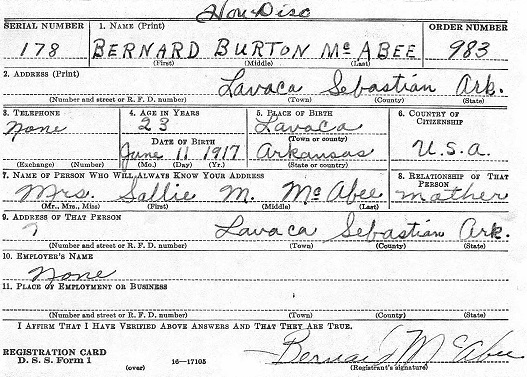 Bernard Burton McAbee was born 11 Jun 1917 in Ursula, Sebastian Co., Ar. to