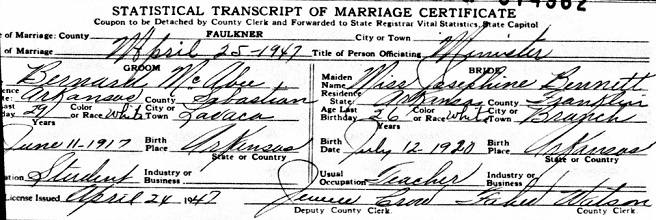 While living at Lavaca, Sebastian Co., Ar. on April 25, 1947 in Faulkner Co., Arkansas he married